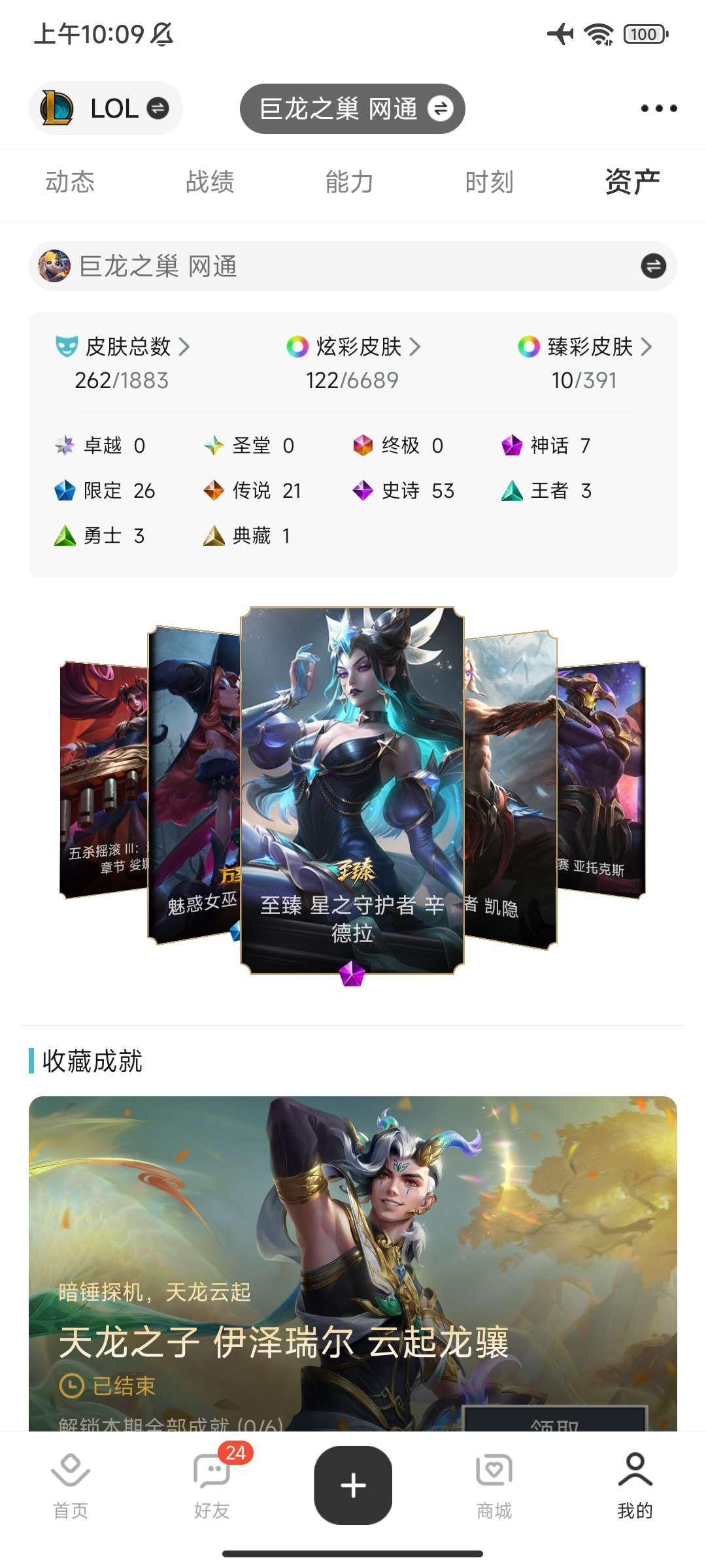 英雄112个,皮肤69个,多个限定皮肤和史诗级皮肤欢迎老板光