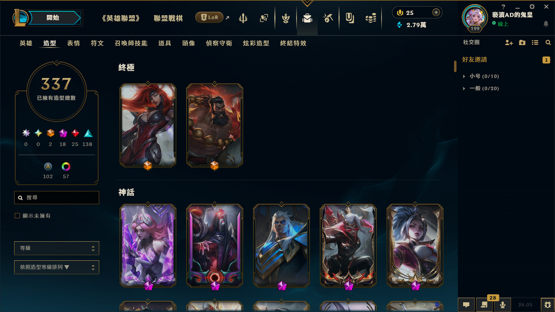 全英雄,1700+皮肤,你想玩的基本都有,可排位云顶有小小亚索,金克斯,盲僧,拉克丝,其他直接看图片