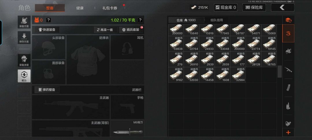 【柯恩币:1502k】有大量现金可供猛攻玩家使用,护航首选,仓库内的全护甲和满改枪可随便使用,禁止使用保险库内东西