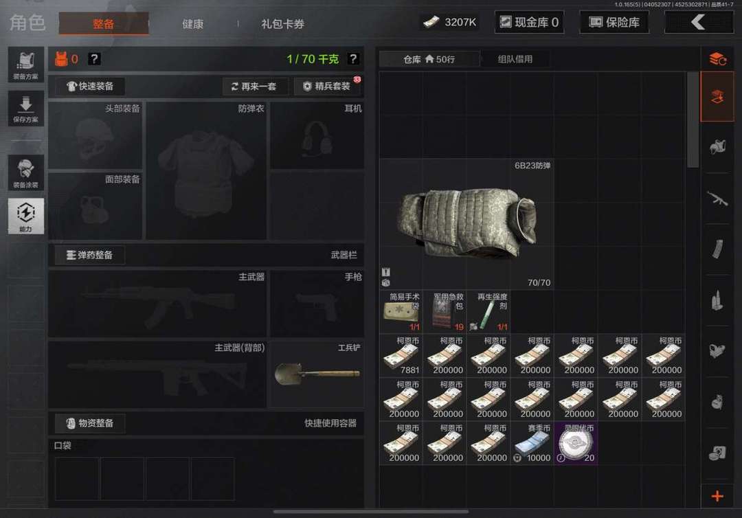 科恩币充足,枪装备的皮肤都有,详情看截图,有6格安全箱,科恩币1.3个亿