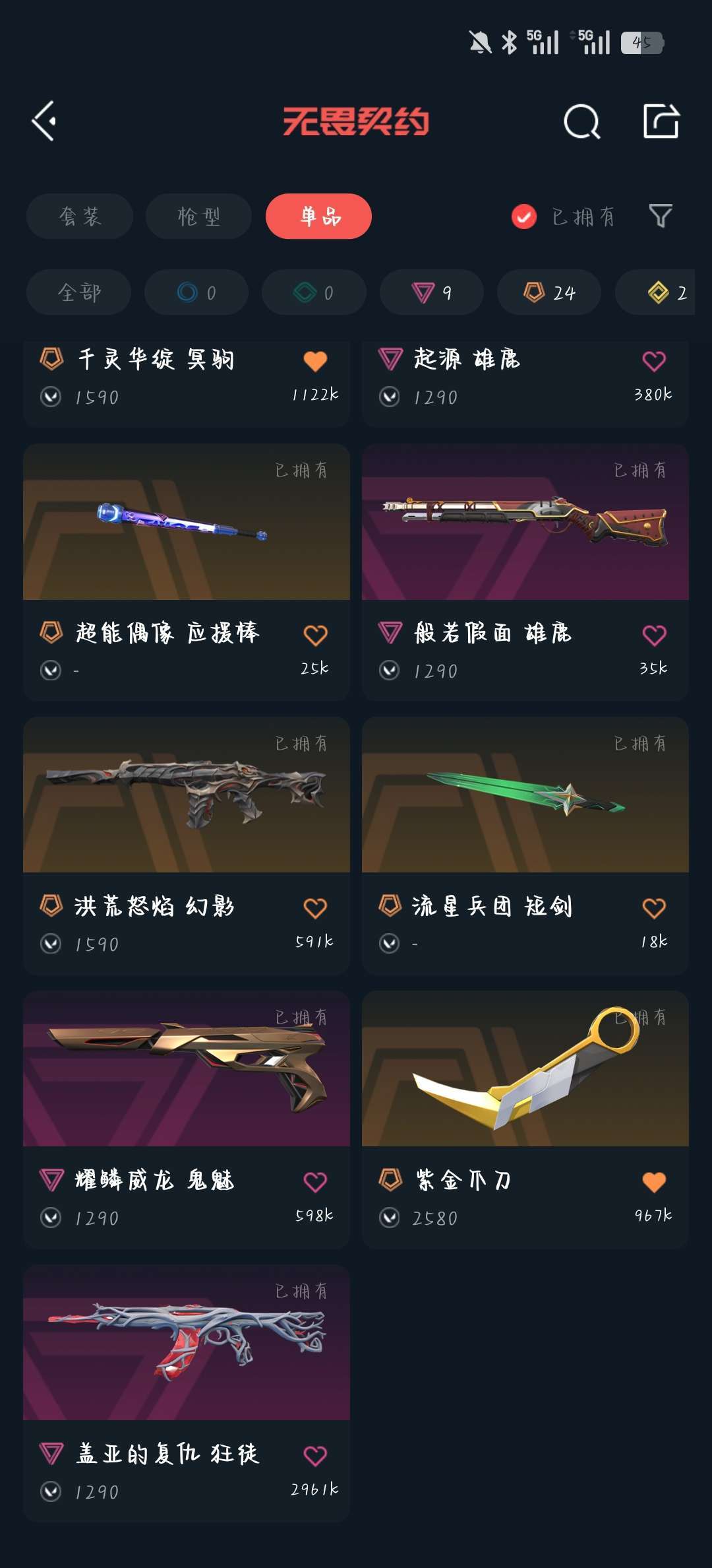 【铂金I】24冠军套装,新莲花套,狂徒三幻神,流脓ak,起点蝴蝶刀,塑水宗正义,青龙大狙。