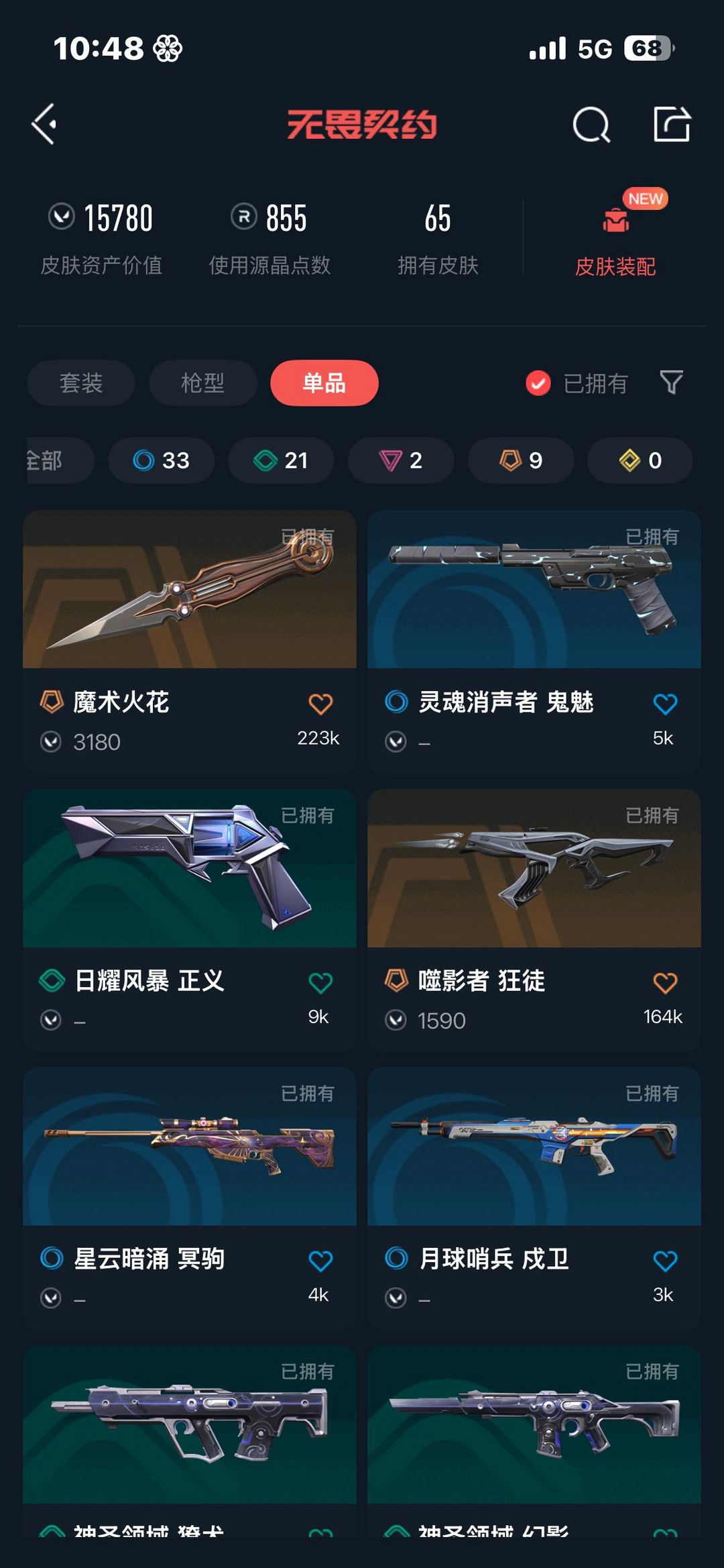【当前段位:钻石III】288 皮肤,有21.22.23.24.25冠军全套,有金克丝正义离火刃vct爪刀和大部分热门刀皮