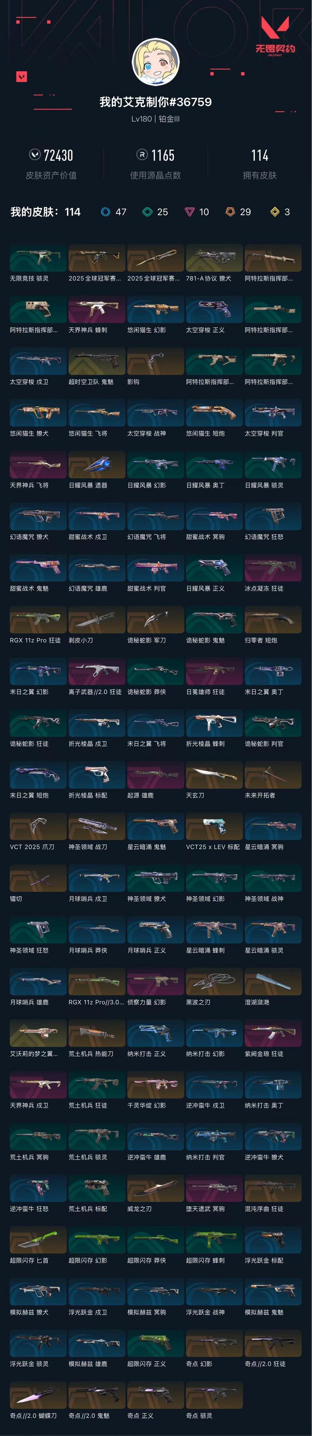 【当前段位:铂金I】❤禁排❤光谱标配vct爪西部套⚡紫金套⚡离火刃白太奇点蝴蝶天御混沌双城盖亚紫金离子狂徒砰砰西部幻影