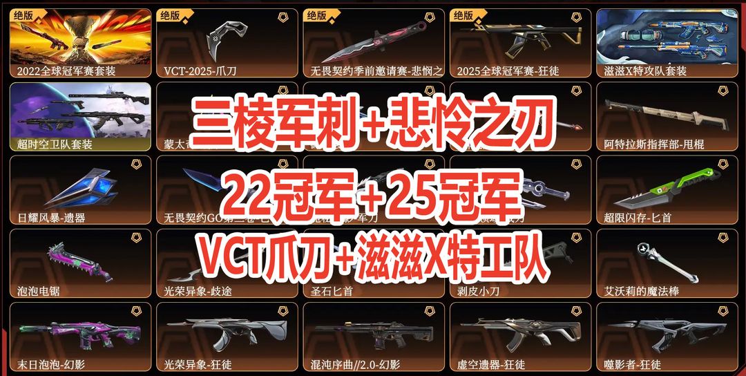 【黄金III】25w库存⚡21冠军套⚡篆刀⚡vct爪刀⚡25冠军狂徒⚡塑水套⚡流风回雪⚡星守狂徒⚡电音光谱套