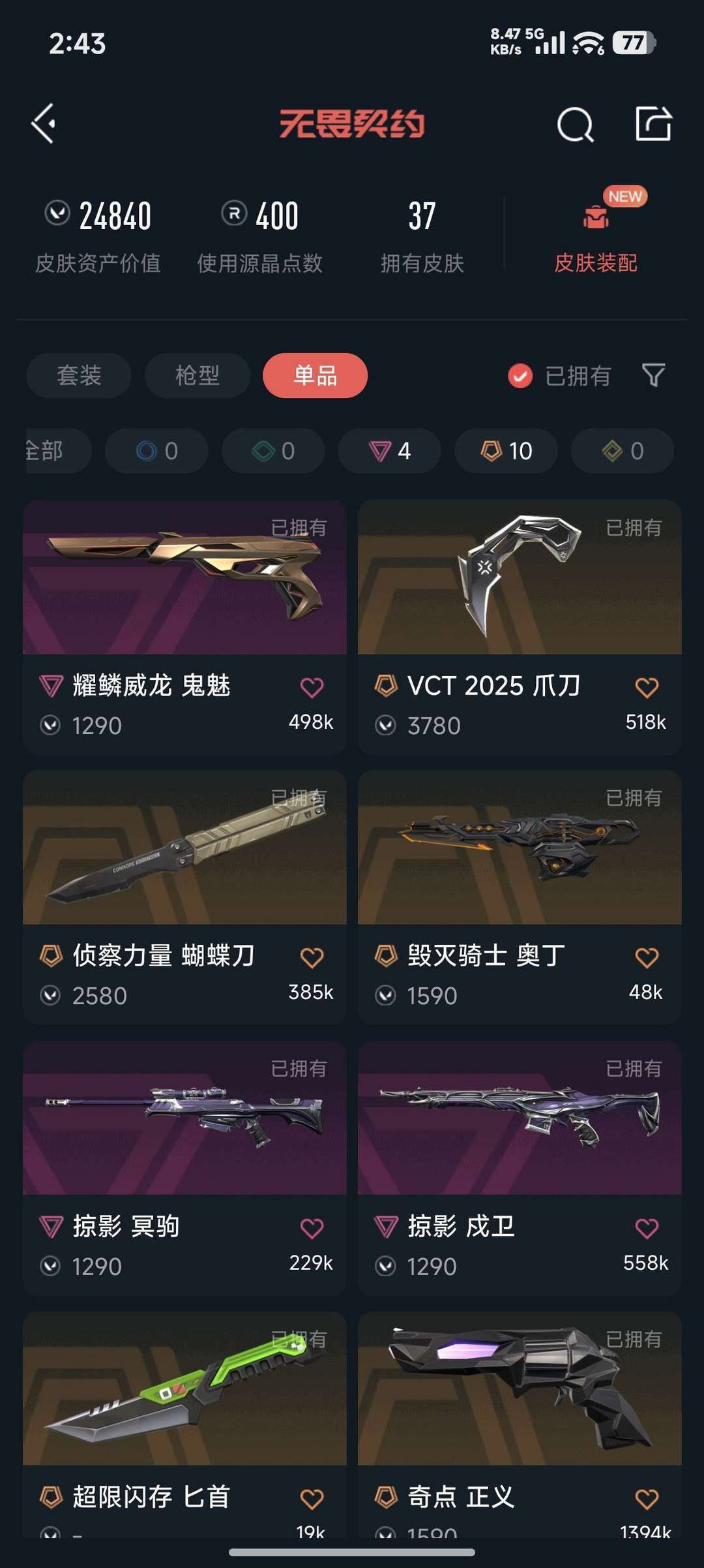 【当前段位:白银I】可排位✨12W库存2000R✨22/25冠军/VCT爪刀✨异象/创纪元/掠影2.0套装✨黑波之刃/魔