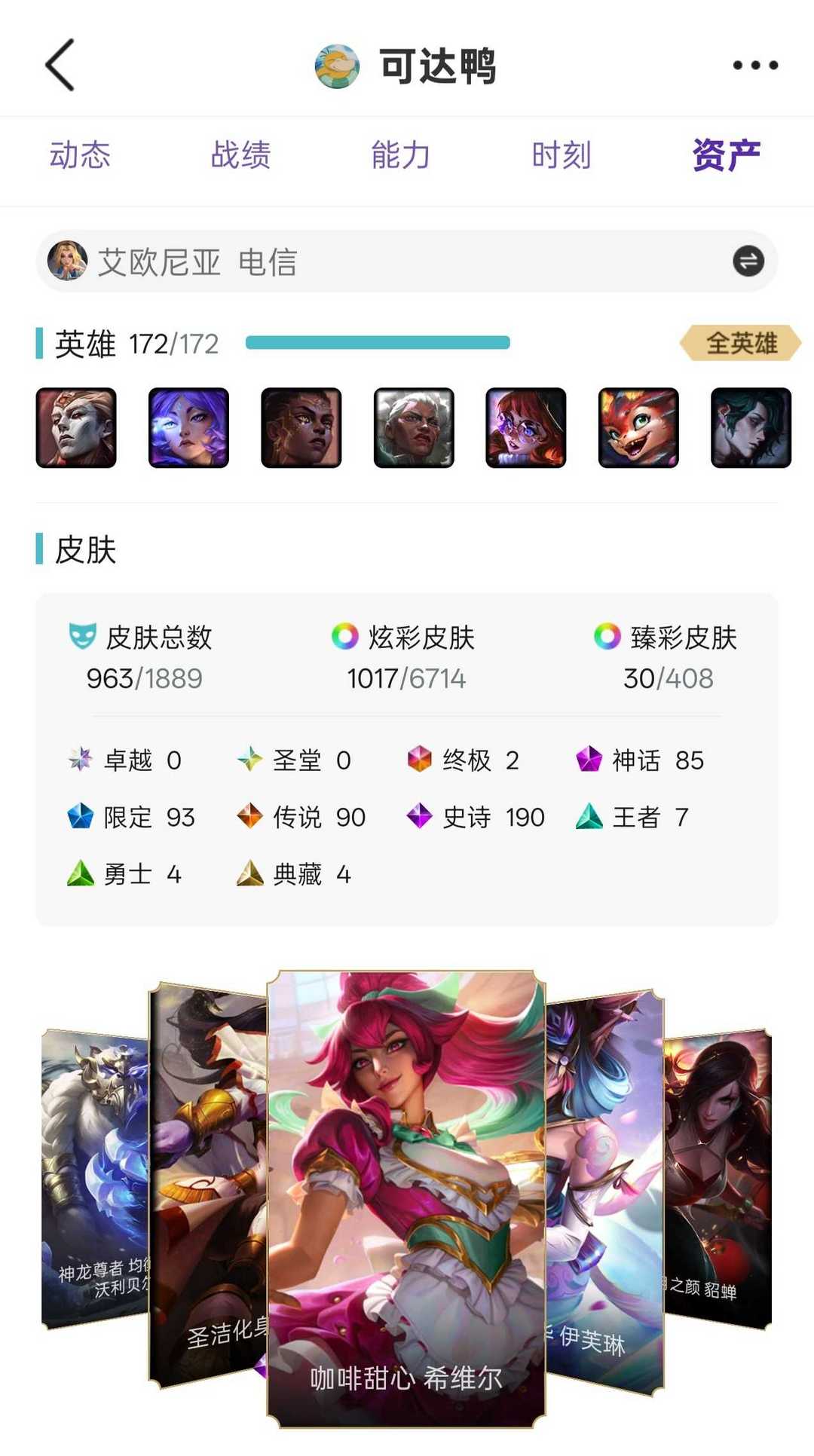 1600P(AD皮肤号)可排位❤️殿堂卡莎/薇恩❤️神话至臻超多❤️全英雄有皮肤❤️年限皮肤快速上号