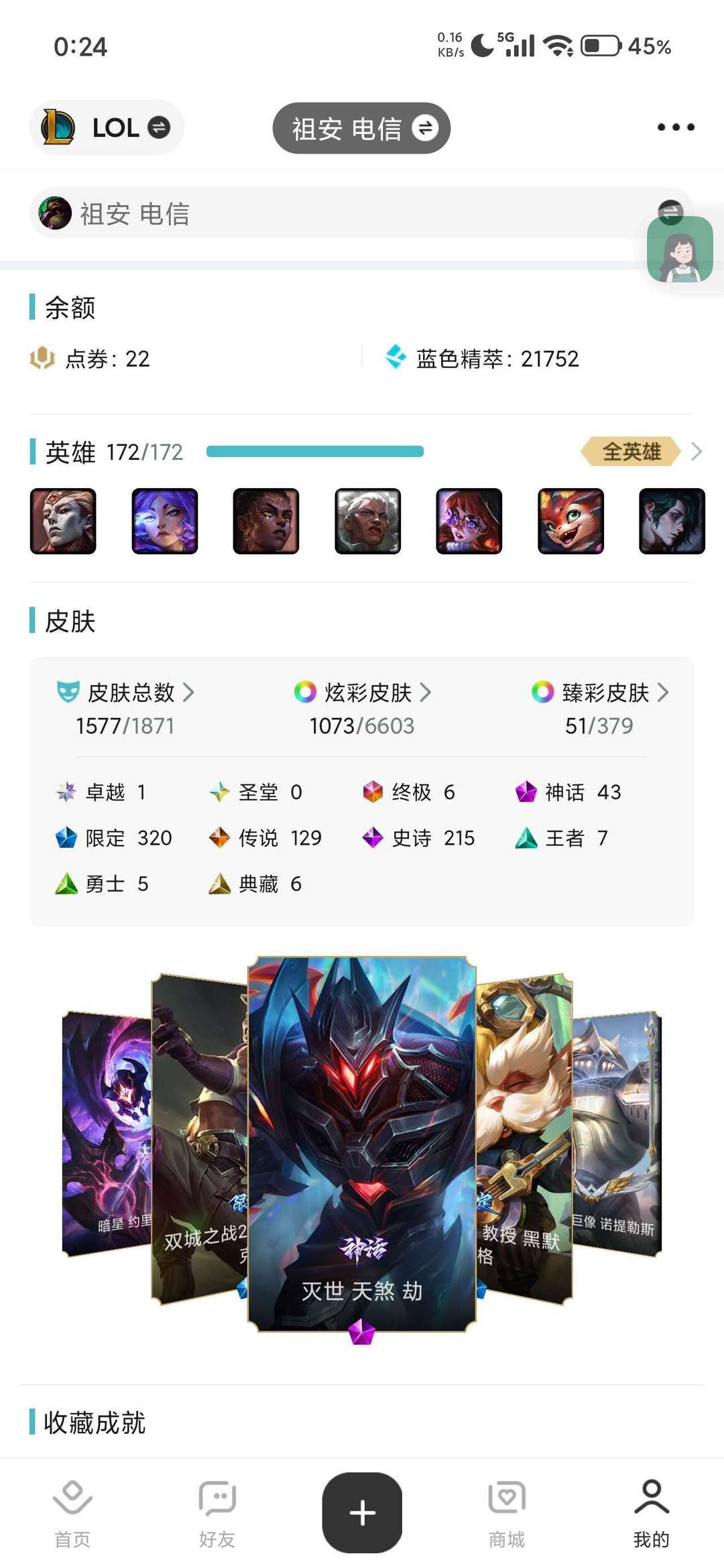 【艾欧尼亚】全皮1093⭐原皮941⭐2圣堂♥4终极♥阿狸神话♥高质量皮肤