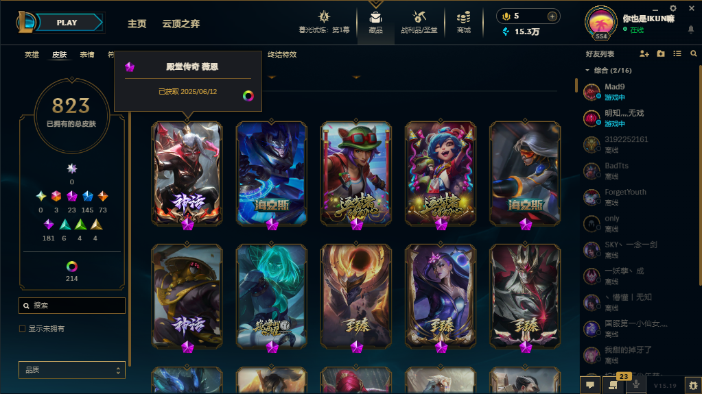可排位钻石段位 皮肤1000,炫彩200神话23,限150,传说70,史诗200,蓝黑龙瞎,神话vn