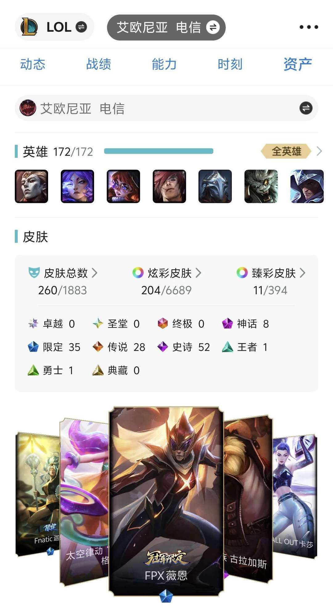 大部分皮肤都有!!!至臻冰女金龙瞎至臻劫至臻乌鸦至臻诺手至臻卡莎至臻琪亚娜+打野+adc+辅助皮肤