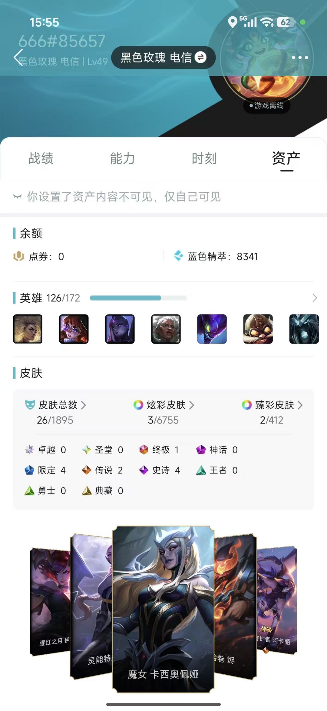 黑色玫瑰,可排位,打野和adc皮肤较多,适合打野,adc的绝活哥,各种限定,至臻,传说皮肤