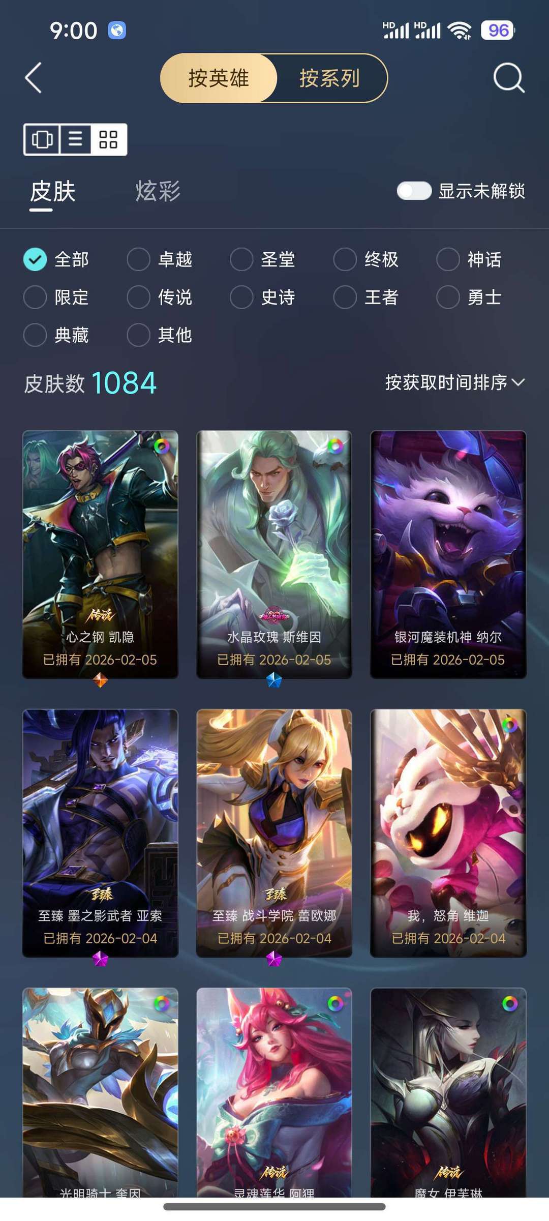 596皮2终极⚡海克斯卡萨丁⚡2周年诺手⚡征服者卡尔玛⚡神王盖伦⚡丧尸火男⚡原计划艾希⚡耀星拉克丝