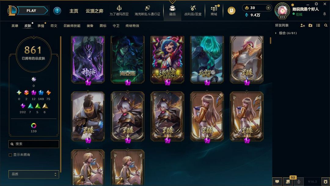 【LOL大王】1000P乄861原皮乄139炫彩乄14臻彩乄12神话乄149限定乄龙虾乄斩星魔剑