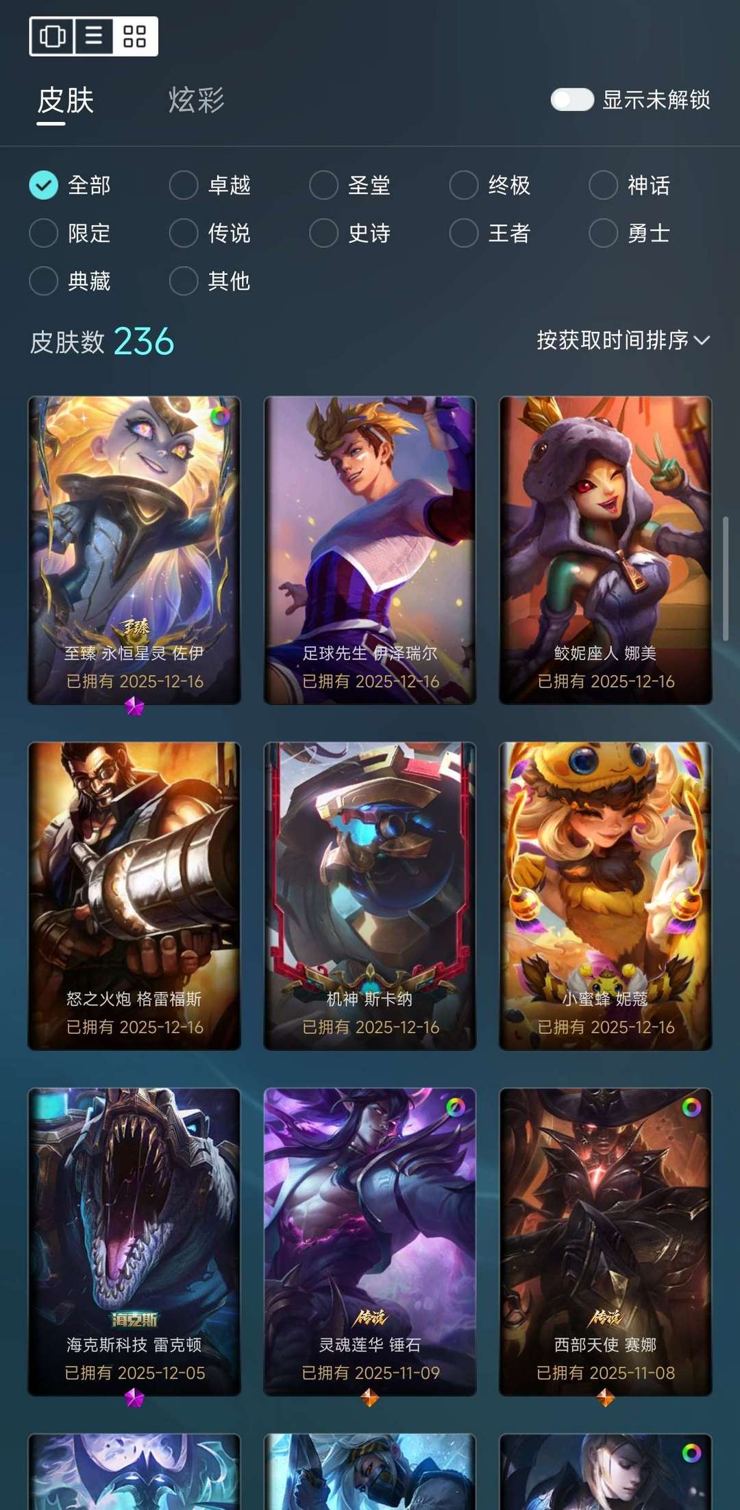 英雄皮肤包含各类传说皮肤,限定皮肤,至臻皮肤,海克斯科技等