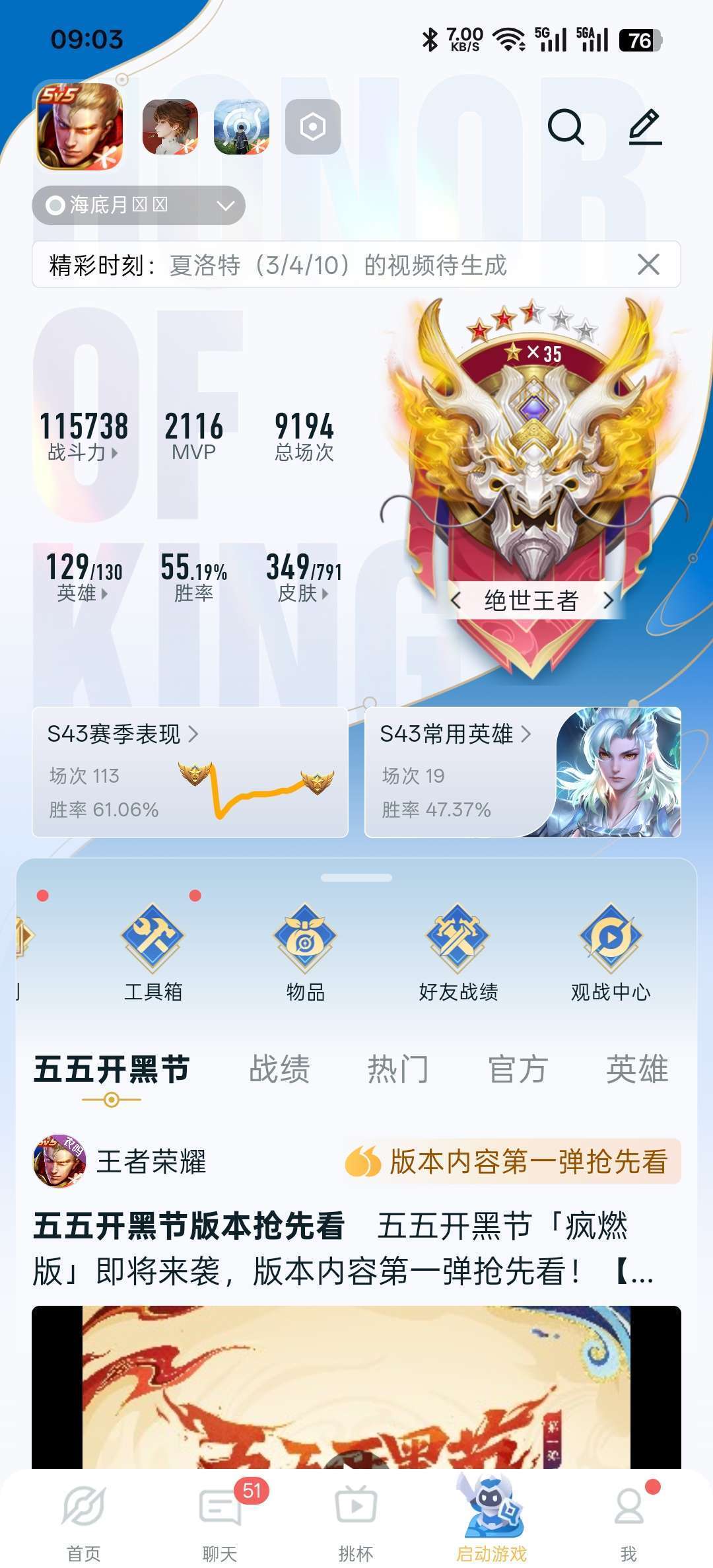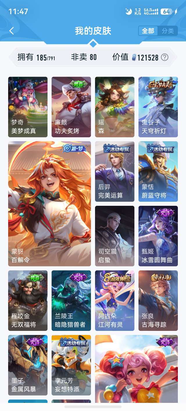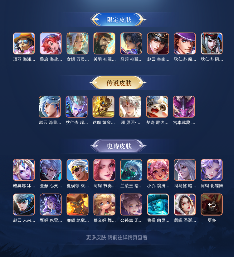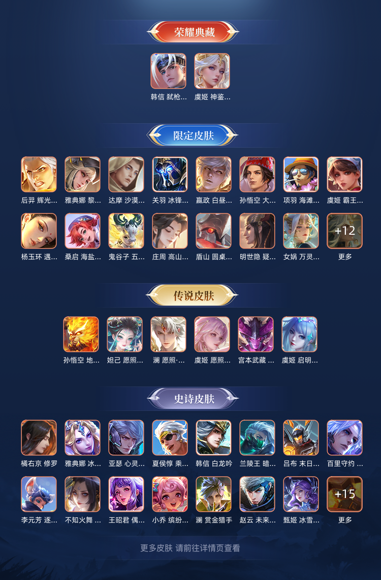 贵族6 传说皮肤6 史诗皮肤500 皮肤数 量185英雄126 最强王者 总场 次7179