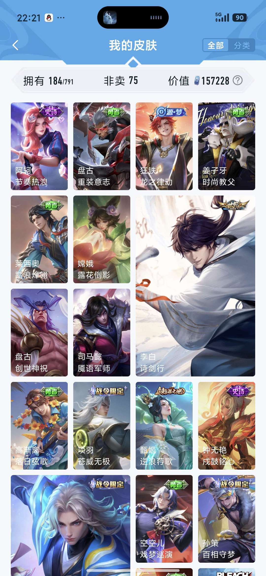 李白的千年之狐跟荣耀典藏皮肤。和孙尚香的末日机甲,镜的炽阳神光,韩信的白龙吟等等。