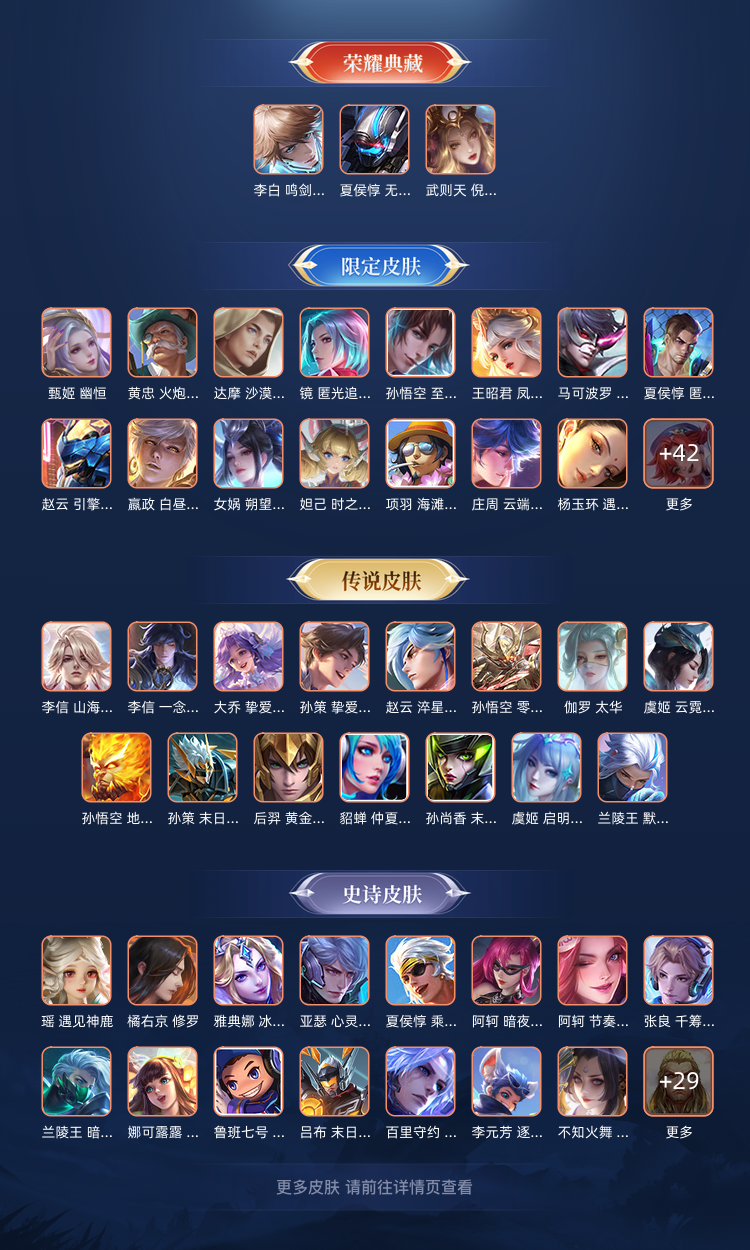 【V7 201皮】[V8]王者号总共189皮,号子贵八,很多传说皮木兰,云缨皮肤几乎全满,其他英雄史诗传说都有