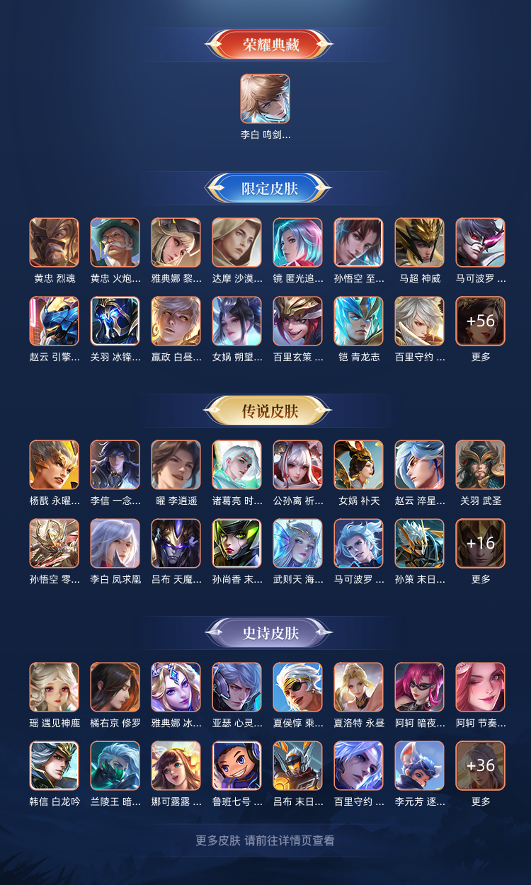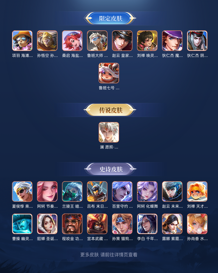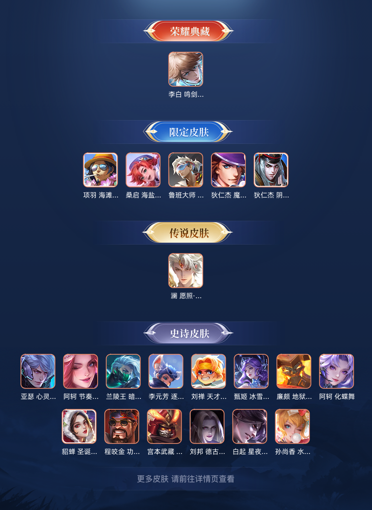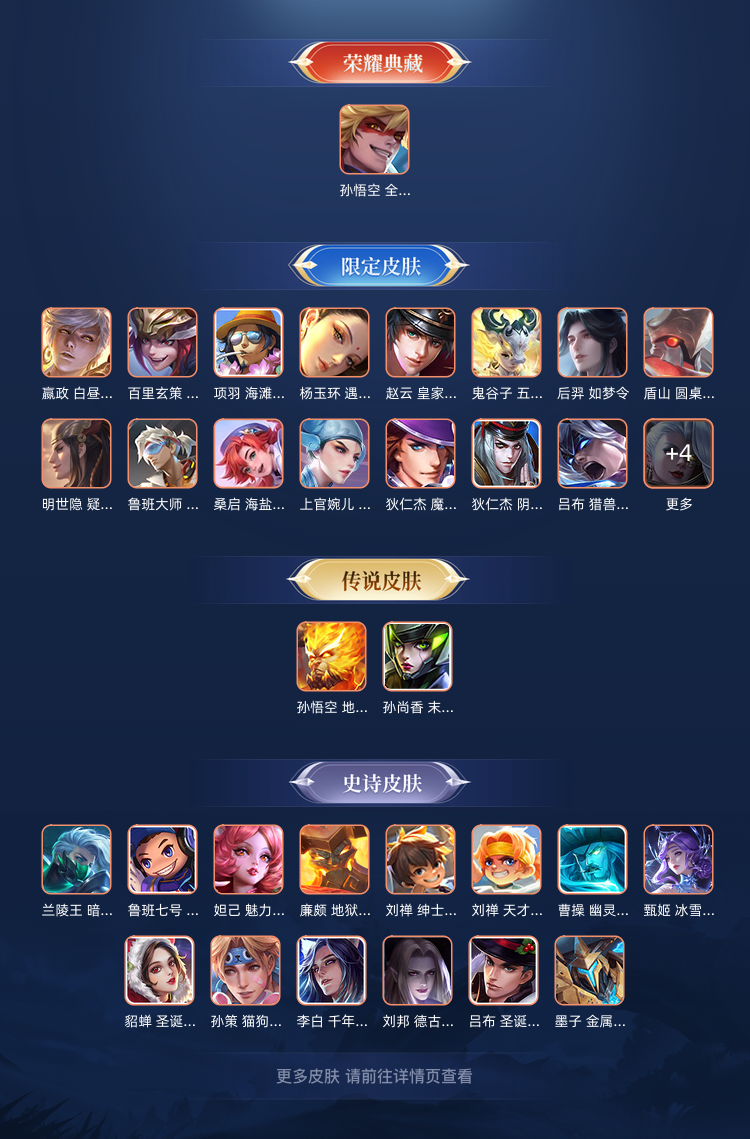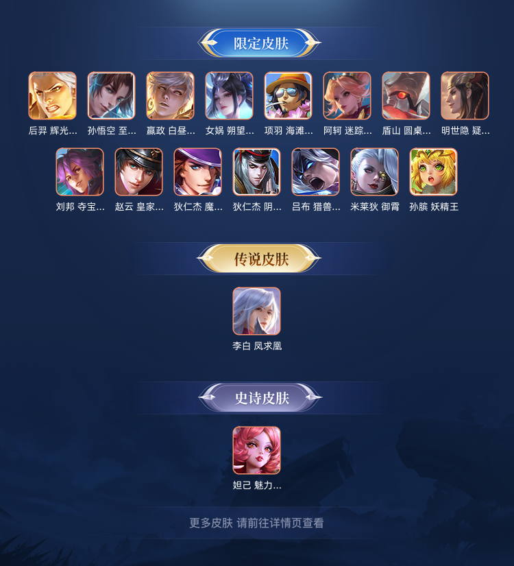 100皮孙悟空(孙悟空 至尊宝);李白(李白 凤求凰);后羿(后羿 阿尔法小队,后羿 辉光之辰);