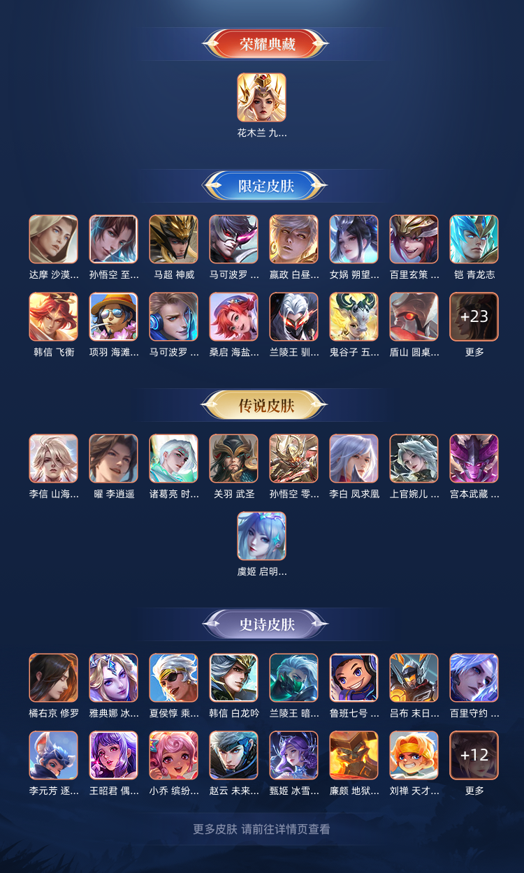 【V7 259皮】1典藏,1珍品,16传说,全息碎影,凤求凰,怪盗基德,一念神魔,武陵仙君等多优质皮肤。