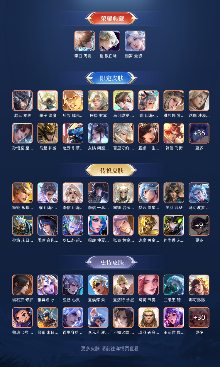【V5 167皮】【V8账号】荣耀典藏+星月皮肤+限定皮肤+史诗皮肤