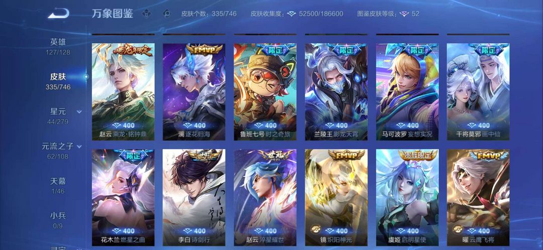 【V6 274皮】虞姬典藏7个传说皮肤(久胜战神,黄金狮子座,冠军飞将,末日机甲等)200+皮肤,126个英雄