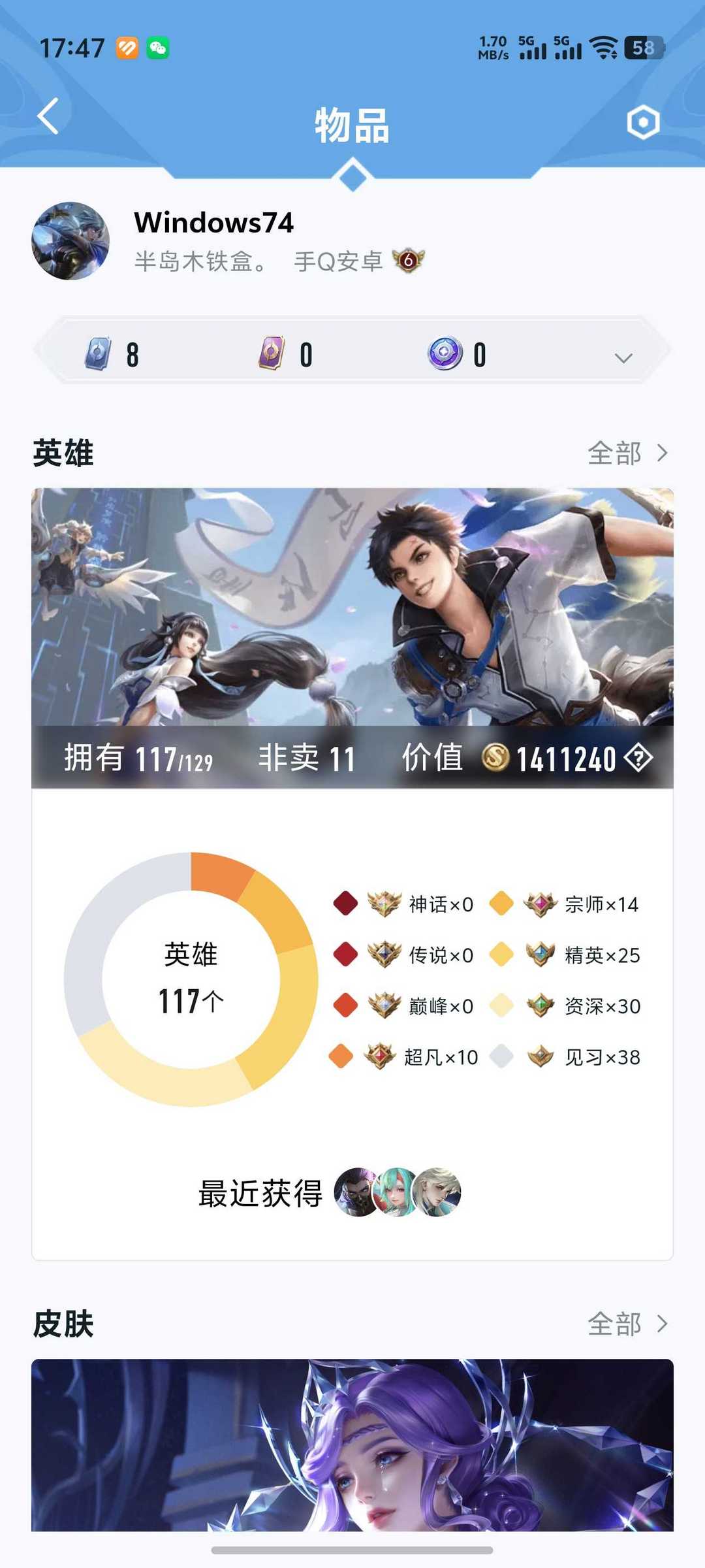 【V10 545皮】290!新凯已补!5典藏6无双3珍品52传说!可以排位!加好 品牌:王者荣耀