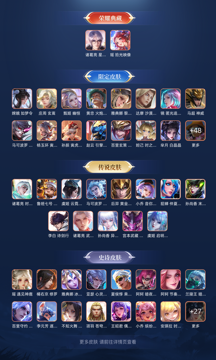 多种传说皮,各种史诗皮,最强王者段所有铭文满级。诚信游戏,不要用游戏号做违规事情,否则将按违约处理