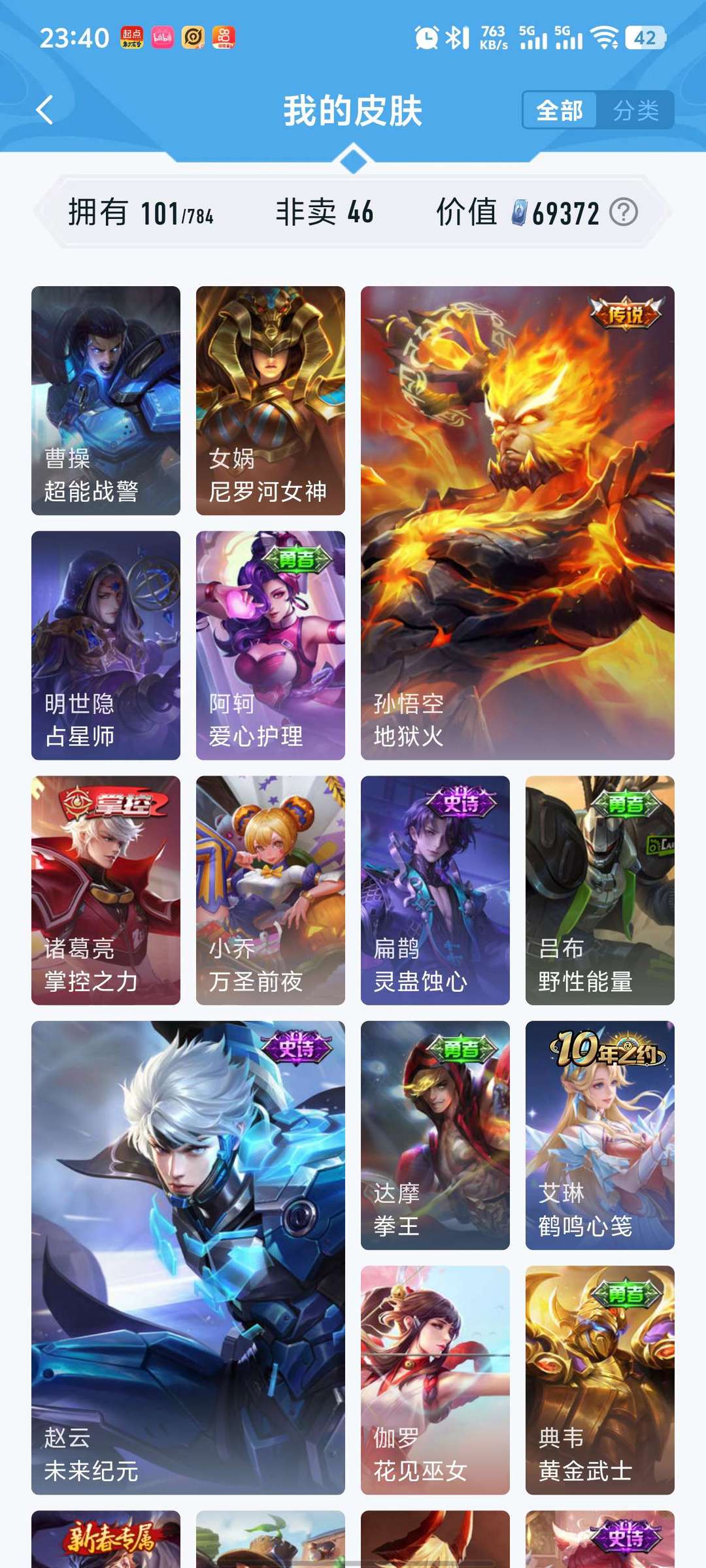 【V7 19皮】9个传说皮,带李逍遥前尘镜白虎志,3w战54段打野,租回去有面子