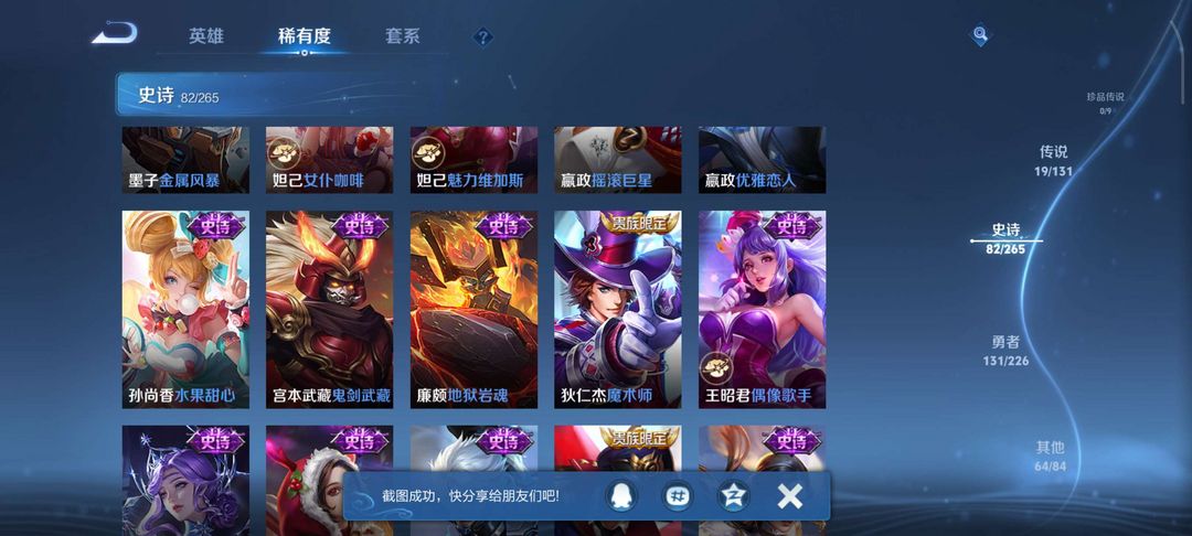 满铭文,贵八一典藏全息碎影,马克双传说限定,司空震女娲年限,孙策虎年年限,有多个精品史诗皮肤