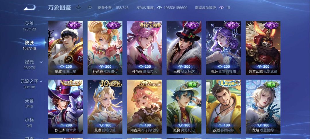 【V6 273皮】虞姬典藏7个传说皮肤(久胜战神,黄金狮子座,冠军飞将,末日机甲等)200+皮肤,126个英雄