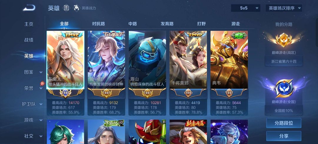 【V5 53皮】1.4w小国标东皇,万战金标盾山,金标云中君,金标游走,带妹上分号,主页有排面