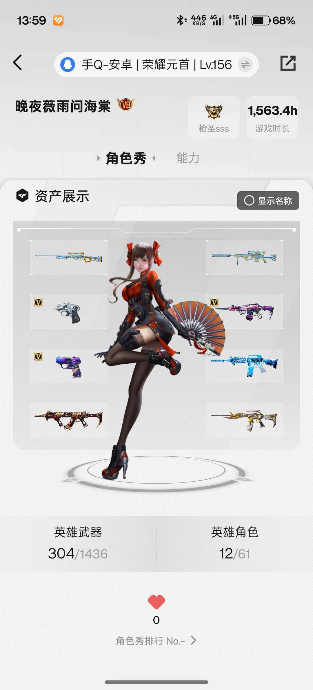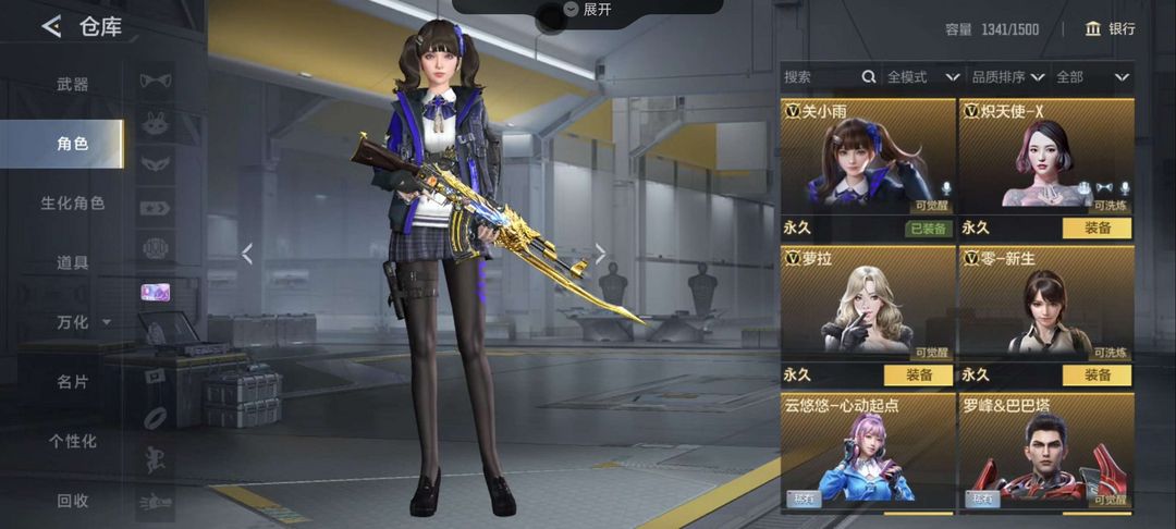 95级平民,角色挺齐全,比较基础的武器都有 毁灭套,枪娘,极光,m4雷神,黑骑士,火麒麟,玫瑰精灵