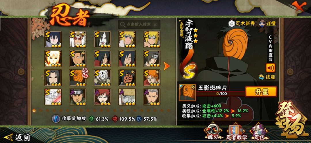 侠隐佐助全套✨机械鸣人全套✨六尾鸣人已秒✨神农漂泊带土全套✨传说三忍自来也✨407全忍者✨72级魅力