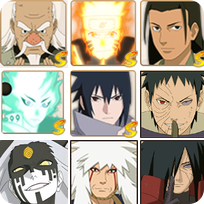 带土(破面,漂泊,十尾,白面具,忍法帖*2),天道超,水门(秽土,金身,新春,百战),九喇嘛,忍法帖