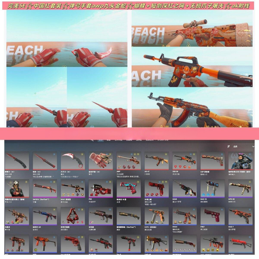 完美5E⭐中国红套装⭐弹弓手套awp九头金蛇⭐蝴蝶+短剑深红之网+无损爪子屠夫⭐ak射