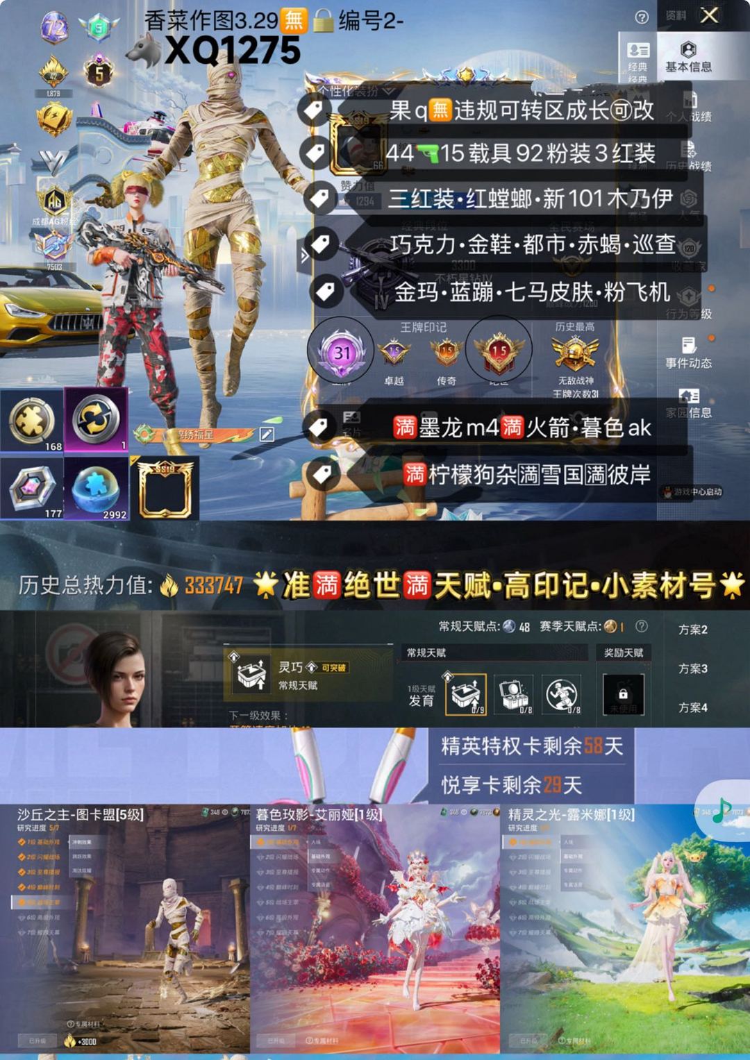 极品单字ID野¥臻藏4满级法拉利最新神君仙姬全套¥20满级车¥42王牌印记¥32把9级枪¥126万热