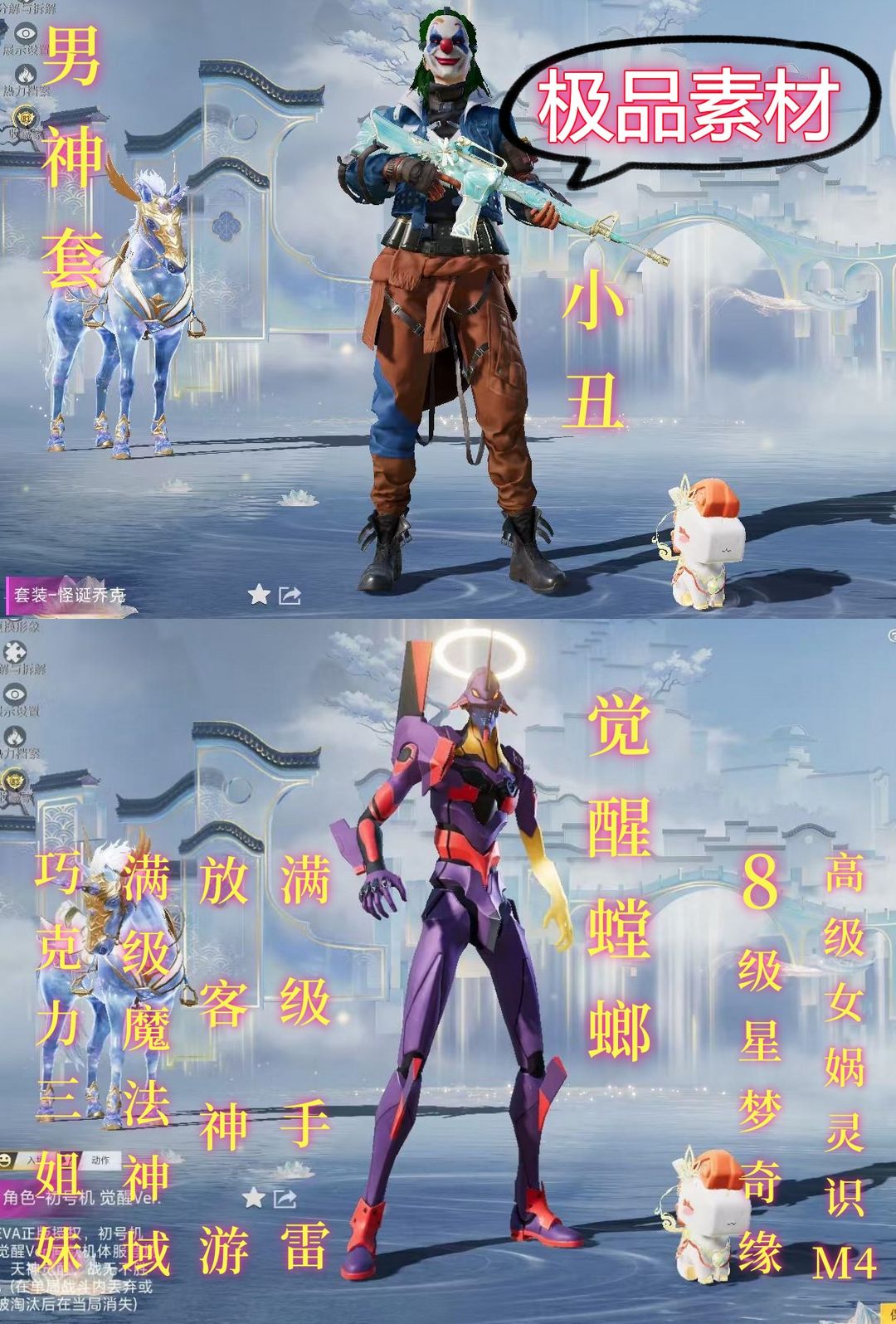 极品素材✨男神套✨小丑✨觉醒螳螂✨巧克力三姐妹✨高级女娲灵识✨8级星梦奇缘✨满级魔法神域✨满级手雷