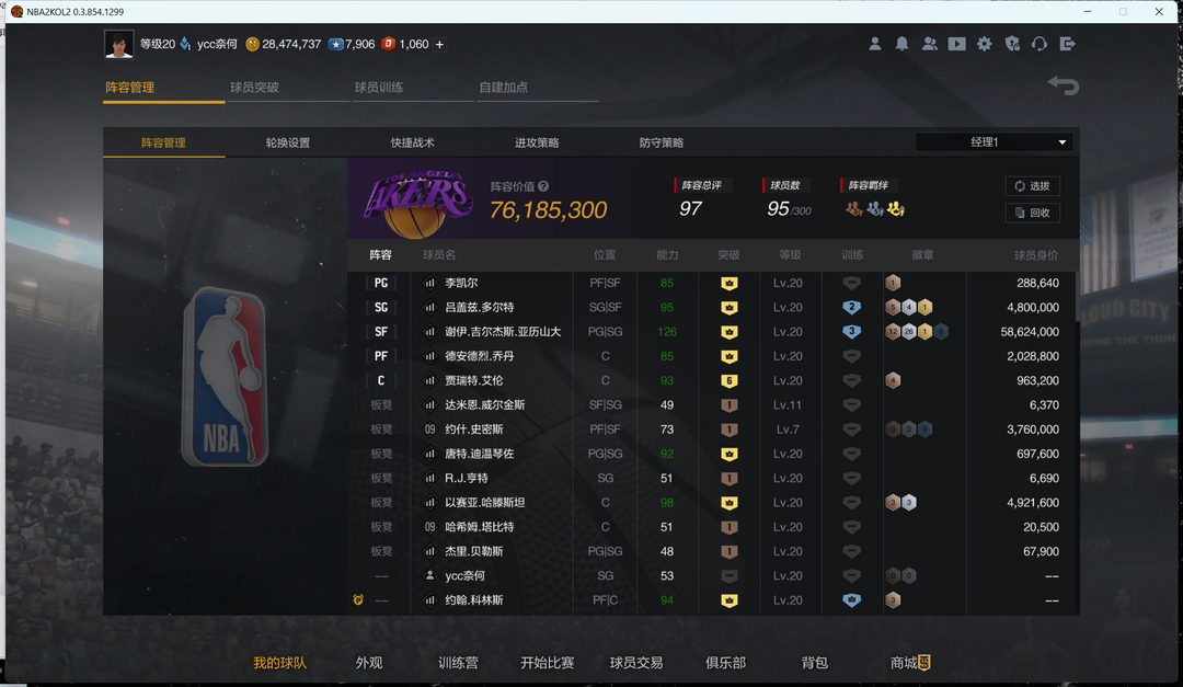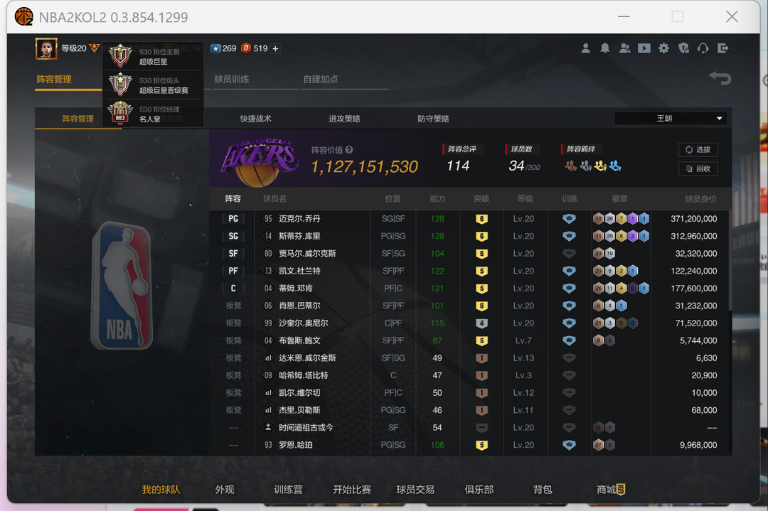 阵容价值3.3亿,段位8个超级巨星、2个巨星、4个全明星、2个当家球星
