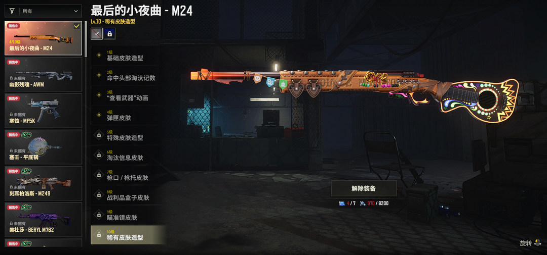 ④级小夜曲M24✅王牌登场M762✅黄道猎手M4✅破碎元素SKS✅漫彩四溢SKS✅君临寒冬98K✅幽