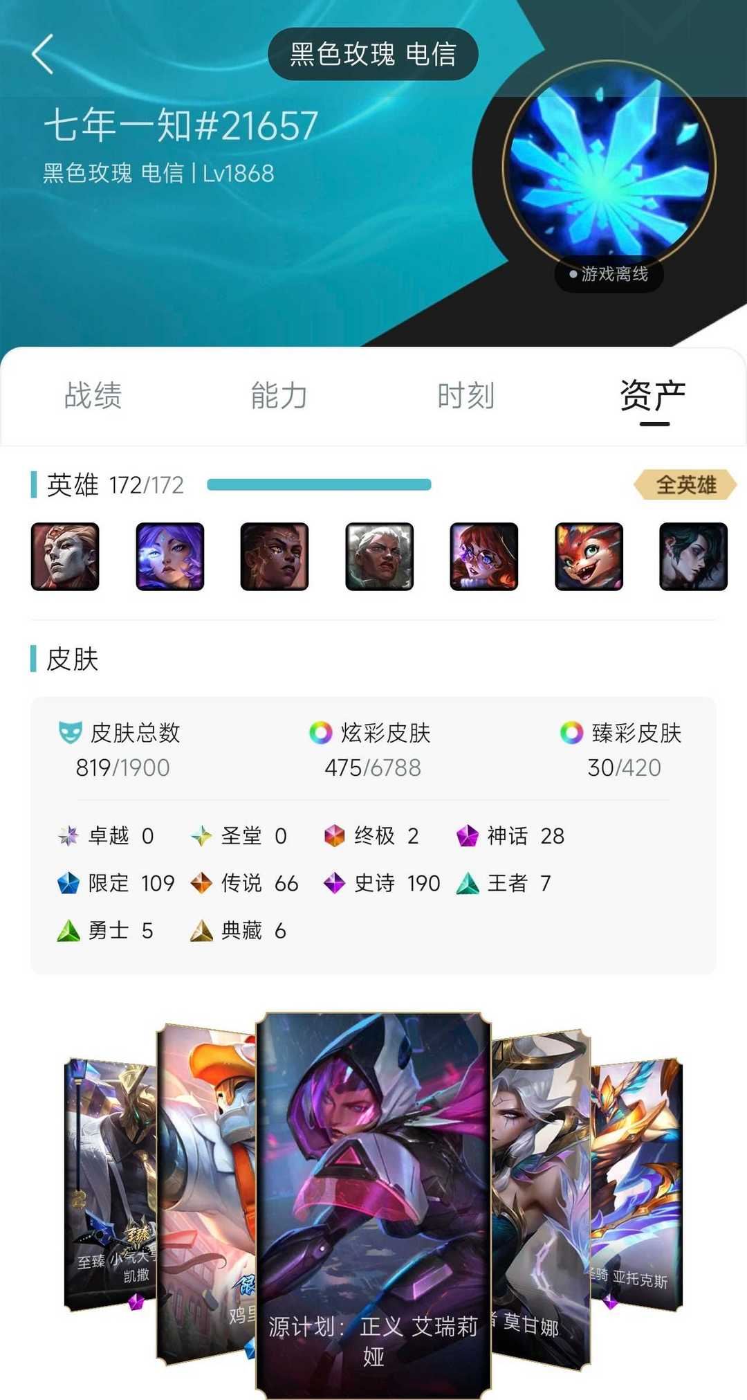 9500皮肤❤全至臻海克斯❤全年限周年❤八色龙瞎❤冰桶莲花