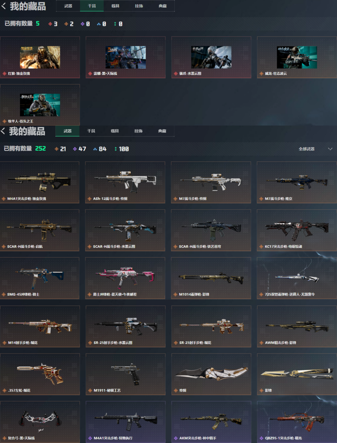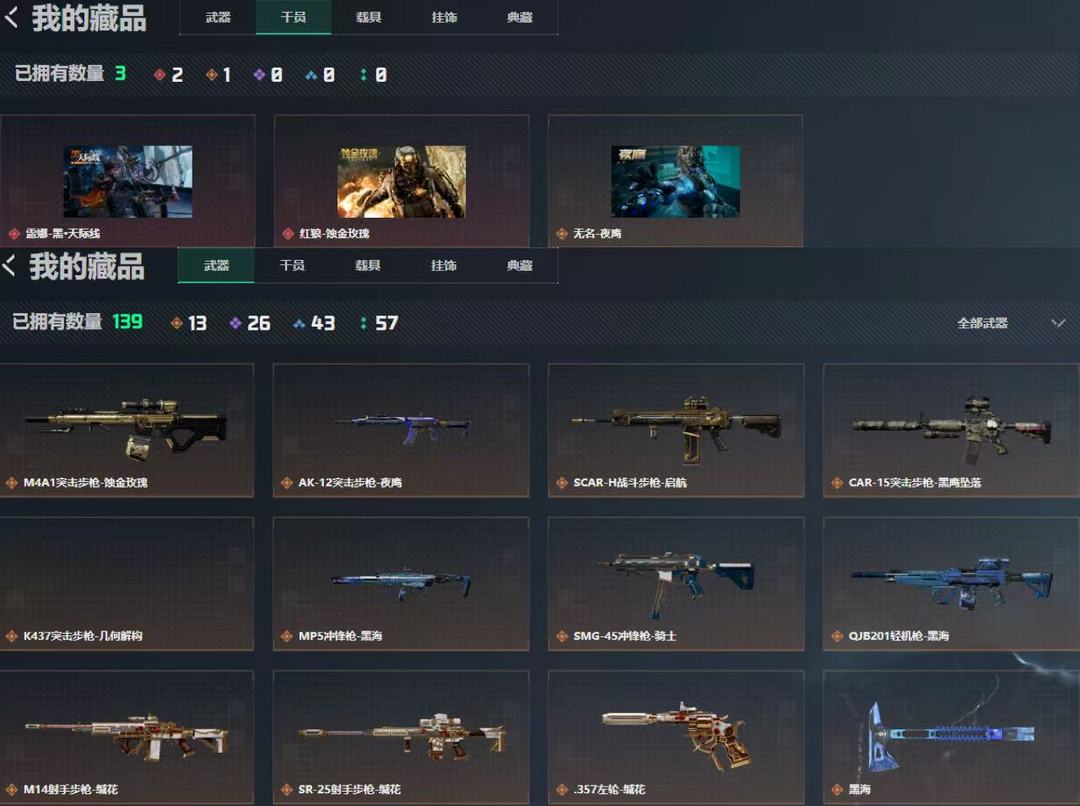 3红双刀 怜悯 蝴蝶刀 23金皮 体力6/负重4/骇爪-水墨云图/红狼-蚀金玫瑰/露娜-黑·天际线/