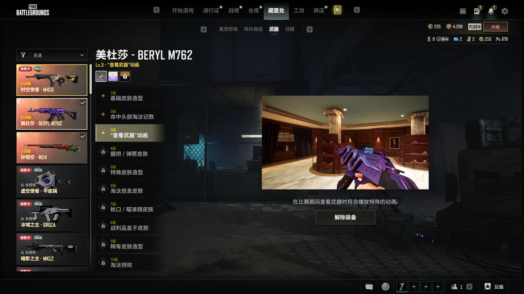 三级美杜莎M762√时空使者M416√孙悟空M24√悲喜套柏林鞋√猫咪挠摩托车√王者风衣√红面巾