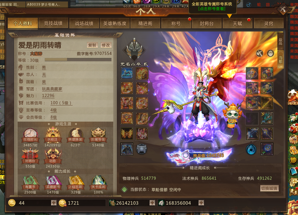 4年少(呂布韩当马良小乔 623)皮肤幻神30W魅力海量玩具需要更换装备彩虹逃跑必拉黑