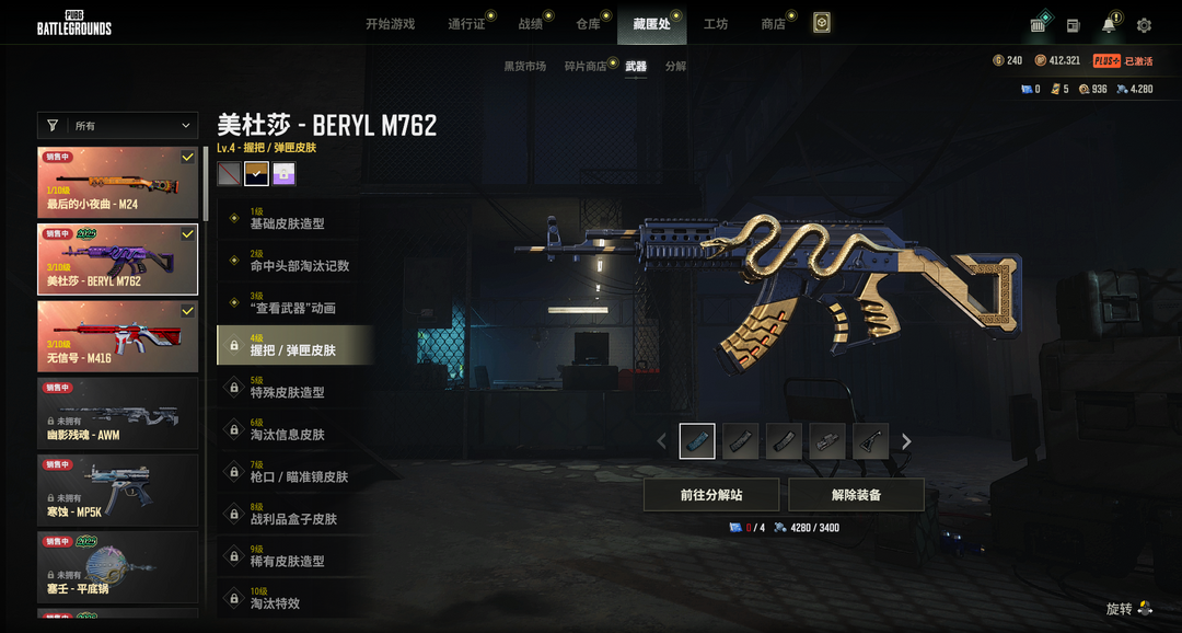 时空使者M416√保时捷跑车√最后的小夜曲M24√烈日灼烧√寒蚀MP05√紫色魔法迷雾√红面具白熊套