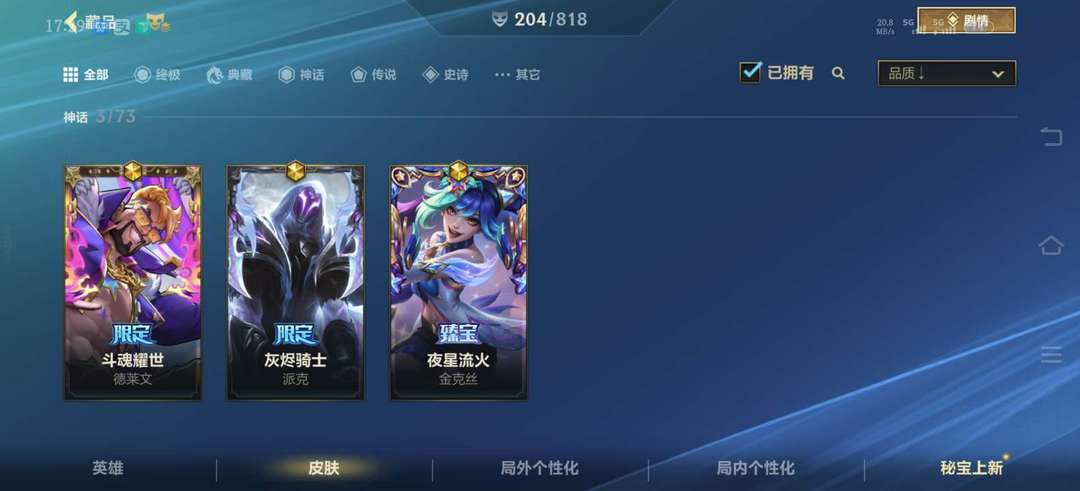78个皮肤 可以排位 一个国标两个金标龙的传人 原计划易 黑暗亚索 神王诺克…