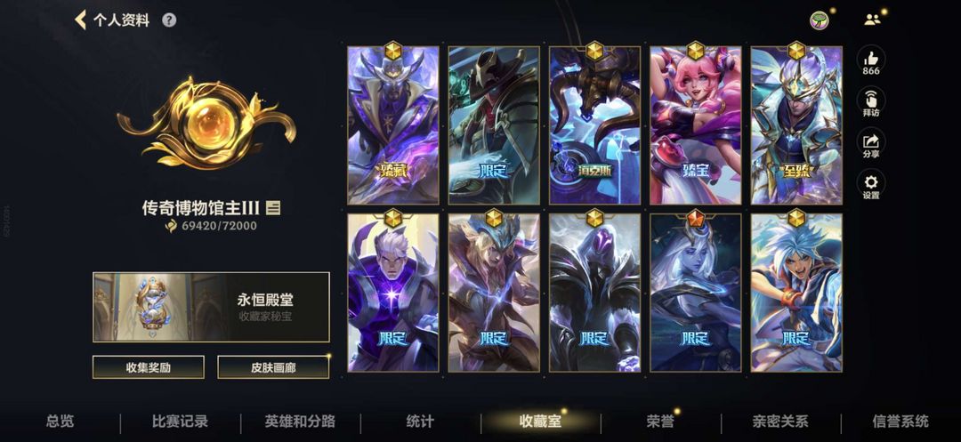 没典藏皮,9神话,50来个传说皮可排位,乱玩拉黑