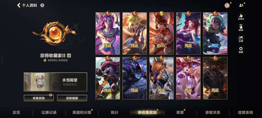 传说皮三个。史诗皮22个,其他为精品皮。赛季皮肤都有。
