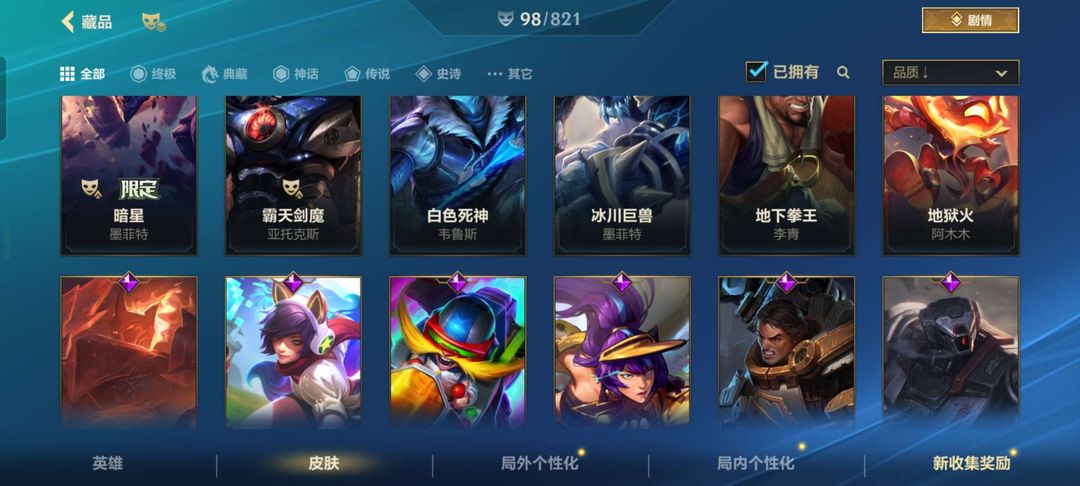 嗯,个人自用号啊,然后可以用来带妹段位不是很高,常用的皮肤都有,主要都是限定皮肤