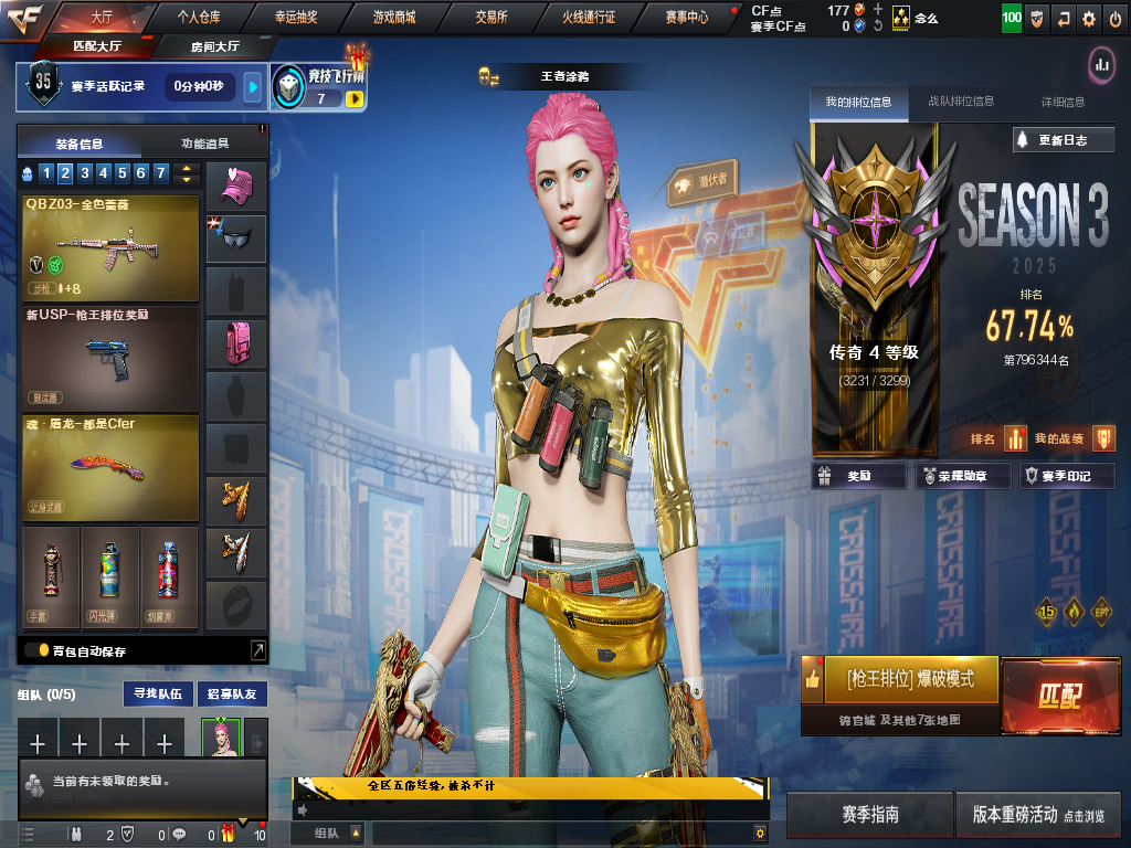【可排位】白虎qbz金色蔷薇段位传奇4带妹必租