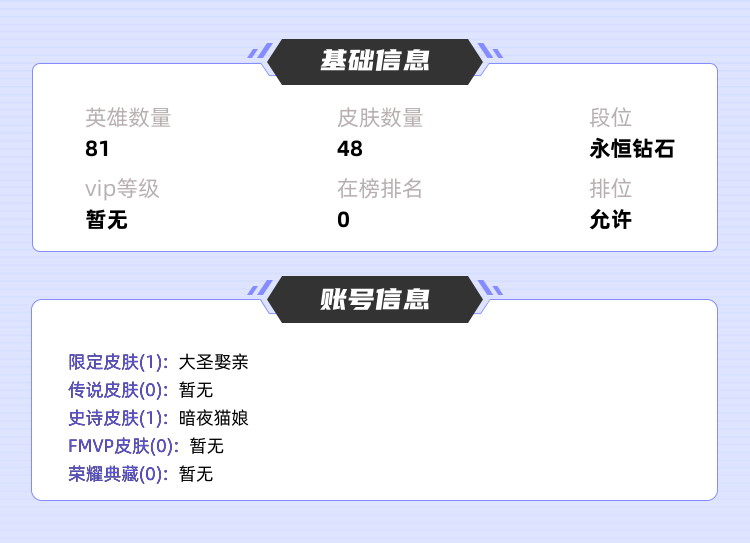 >>>>>>毁号,涉及毁坏虚拟财产罪及计算机安全罪,请文明游戏素质游戏,让我们共建美好租号平台>>>>>> 本游戏账号,基础段位:永恒钻石III,英雄虽然少,应该有你喜欢的英雄,皮肤目前不多,希望有你喜欢的 私人所属英雄皮肤有:孙悟空 大圣娶亲阿轲 暗夜猫娘,等等 注意事项: A.游戏过程中请不要恶意挂机或者不文明发言B.恶意挂机、顶号等行为将被拉黑无法再次下单C.进入游戏后中途请勿退出登陆,否则无法再次上号D.部分账号由于异地登录可能会出现密码错误提示,通常再尝试5-6次后可上号 |||||||||>喜欢本账号请点 ☆收藏☆ 方便下次租用,谢谢光临惠顾|||||||||