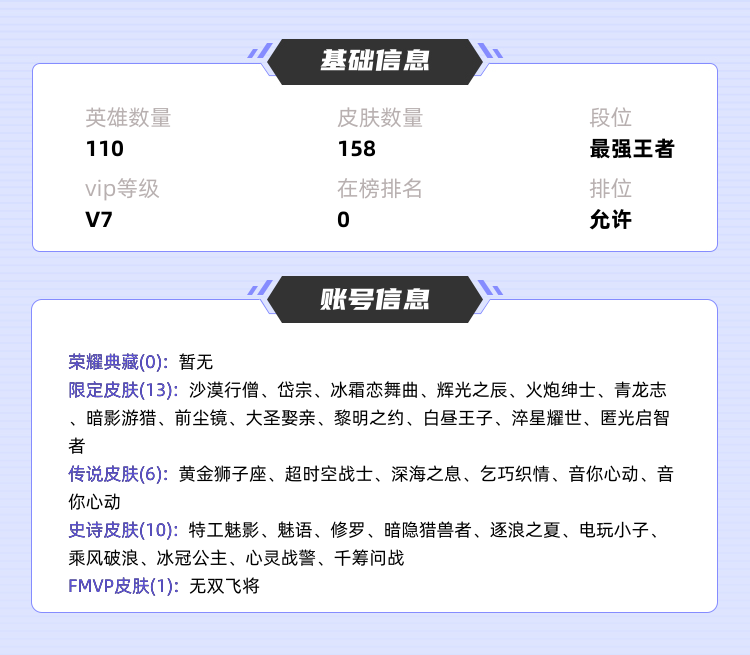 >>>>>>毁号,涉及毁坏虚拟财产罪及计算机安全罪,请文明游戏素质游戏,让我们共建美好租号平台>>>>>> 本游戏账号,英雄多,皮肤多。,尽情享受FMVP皮肤带来的主角光环 私人所属英雄皮肤有:达摩 黄金狮子座||狄仁杰 超时空战士||马可波罗 深海之息||王昭君 乞巧织情||小乔 音你心动||周瑜 音你心动马超 无双飞将达摩 沙漠行僧||典韦 岱宗||干将莫邪 冰霜恋舞曲||后羿 辉光之辰||黄忠 火炮绅士||铠 青龙志||马可波罗 暗影游猎||娜可露露 前尘镜等等 注意事项: A.游戏过程中请不要恶意挂机或者不文明发言B.恶意挂机、顶号等行为将被拉黑无法再次下单C.进入游戏后中途请勿退出登陆,否则无法再次上号D.部分账号由于异地登录可能会出现密码错误提示,通常再尝试5-6次后可上号 |||||||||>喜欢本账号请点 ☆收藏☆ 方便下次租用,谢谢光临惠顾|||||||||